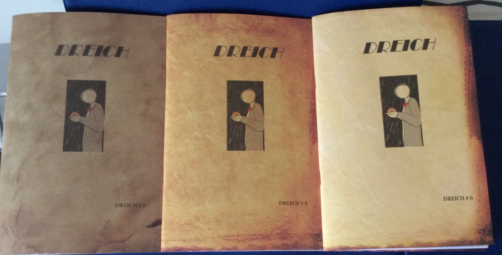 Received these three contributor copies of Dreich # 6, one for each poem accepted. Nice touch. And look at how each copy is different. Thanks to editor Jack Carodoc.